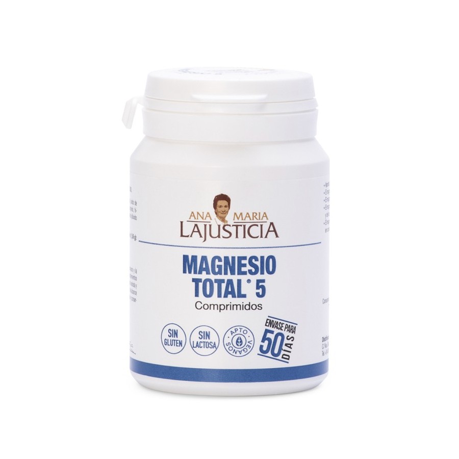 El Magnesio total 5 de Ana Maria Lajusticia es un complemento alimenticio elaborado por un conjunto de 5 fuentes de magnesio, entre ellas citrato de magnesio y bisglicinato de magnesio, lo que le confiere una alta biodisponibilidad y mejor absorción.