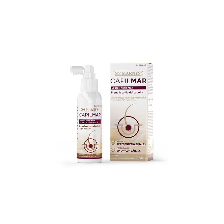 MARNYS® CAPILMAR Loción Anticaída es un spray para el cuero cabelludo de fácil aplicación con cánula, que frena la caída intensa y/o acelerada del cabello. Sus ingredientes activos actúan prolongando la fase de crecimiento del cabello.