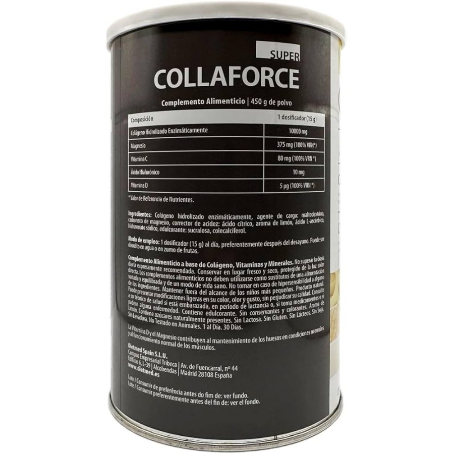 Super collaforce 10000 + magnesio limón de Dietmed ayuda al bienestar general, a nuestros huesos, piel y cartílagos, así como preserva los niveles de colágeno en el cuerpo y es una fuente de colágeno altamente rico.