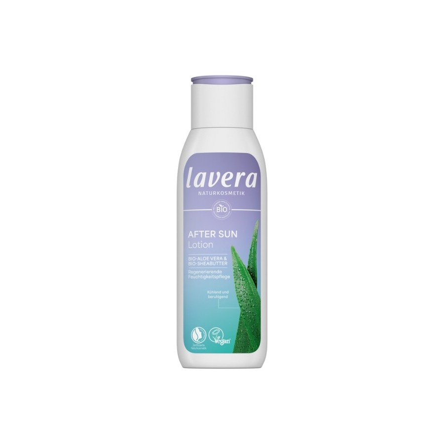 Después de un día de sol, hidrata y repara la piel con la Loción Aftersun con Aloe Vera y Manteca de Karité Bio de Lavera, perfecta para calmar la piel infantil.