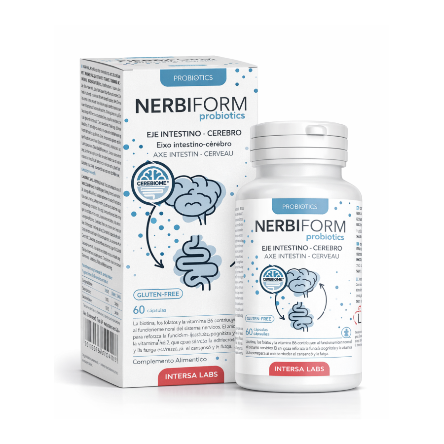 Nerbiform Probiotics de Intersa es un complemento alimenticio en cápsulas formulado con biotina, folatos y vitamina B6, diseñado para integrarse en la dieta diaria y favorecer el equilibrio del eje intestino-cerebro. Su combinación de vitaminas del grupo B contribuye a la función psicológica normal y ayuda a mantener el correcto funcionamiento del sistema nervioso.